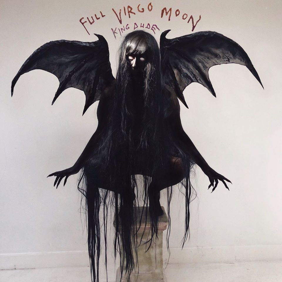 King Dude est un peu un alien dans son domaine. Et pour cause ; son domaine est taillé à la serpe au sein d’une niche musicale, ou plusieurs. On pourrait décrire sa musique comme du folk gothique. Soit quelque part entre la dark americana, le folk rock pur et le rock gothique tristoune. Le tout avec une aura sulfureuse (King Dude est sataniste) et un mépris affiché de l’avis d’autrui sur sa musique. Est-ce que je vais pour autant me priver de le donner, mon avis ? Que non. Parce que moi aussi, je me fous de tout. « Full virgo moon », donc, est un disque composé très rapidement (deux semaines ont suffi) et qui renoue avec un style plus épuré, qui globalement est celui des débuts. L’imagerie a donc beau rappeler le metal, on y est pas du tout ici. A qui donc s’adresse ce disque ? On se demande en effet si les folkeux oseront ne serait-ce qu’y écouter une paire de titres. Et comme sur les autres disques du bonhomme, il y a du bon et du moins bon sur « Full virgo moon ». L’album commence par une excellente intro assez dark ambiant, puis enchaîne avec un titre plus folk assez réussi même s’il a tendance à tirer en longueur (« My rose by the sea »). « Full virgo moon » est plus posé et mélancolique. « Forty five says six six six » est une ballade dark country typique (mais ça marche toujours). « The satanic temple » est une ballade également, mais plus pop folk ambiant. « Forgive my sins » dégaine le piano et les cordes, à raison ; c’est l’une des chansons les plus touchantes et réussies du disques, si ce n’est la meilleure. On arrive ensuite à une doublette assez étrange : « Make me blind » et « A funeral song for atheists » sont jumelles de texte, mais pas d’ambiance. La première s’inscrit dans un registre pop psyché, tandis que la deuxième est une ballade au piano assez soporifique. Enfin, « Something about you » repart vers la pop psyché ambiant, mais ne s’avère pas plus passionnante. Au final, je ne sais que penser de cet album, qui me donne l’impression d’avoir été posé là sans réelle réflexion, comme un point d’étape répondant à un besoin de s’exprimer plus qu’une « œuvre ». Alors moi aussi, je vais l’écouter « en passant », sans lui laisser beaucoup d’espoir d’un deuxième rencart.